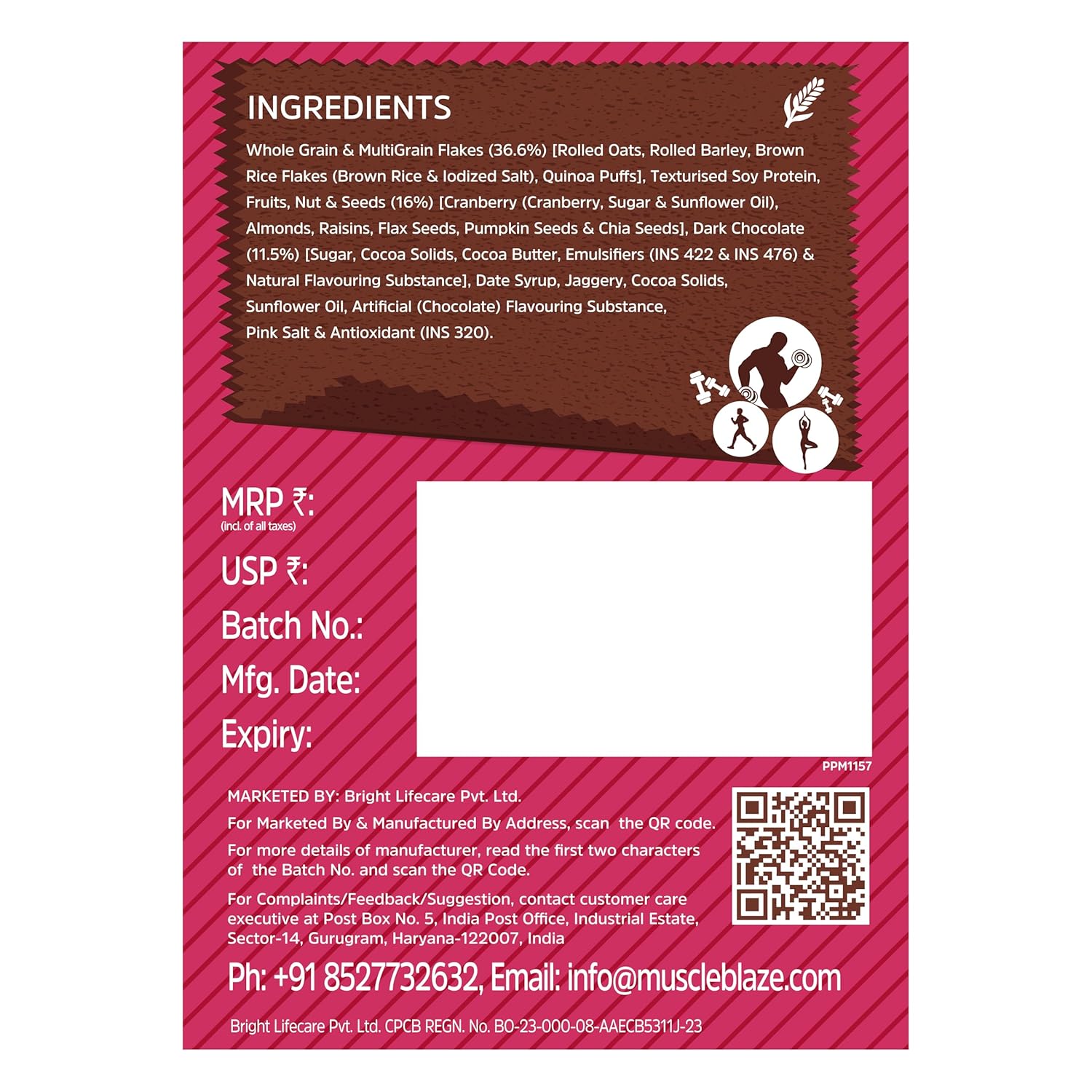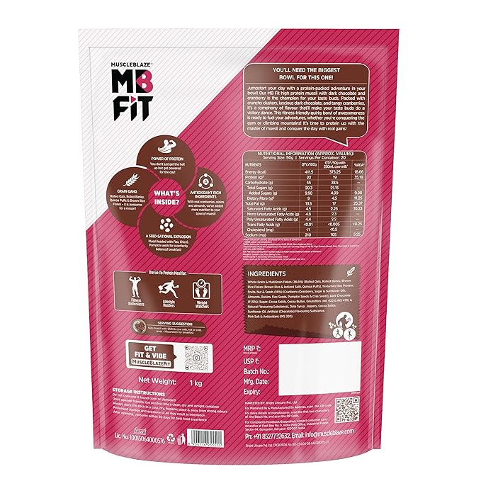 - TASTY CRUNCHY MUESLI: MuscleBlaze Fit High Protein Muesli is available in two flavours – Dark Chocolate & Cranberry and Fruit & Nut